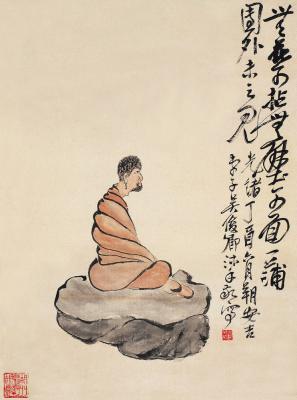 设色纸本 立轴 1897年作 识文: 无花可拈,无壁可面,一蒲团外未之见。光绪丁酉六月朔,安吉弟子吴俊卿沐手敬写。 钤印: 苦铁不朽 湖州安吉县 WU CHANGSHUO BUDDHA FACING THE WALL Color and ink on paper, hanging scroll Dated 1897 尺寸: 65.5×49cm