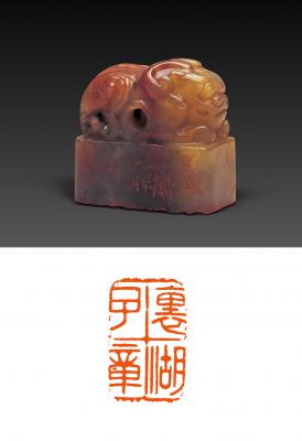 印文: 里湖子章 边款: 里湖子属,无寐刻。 A DULINGKENG STONE SEAL BY CHEN ZIFEN 尺寸: 2.8×1.8×2.5cm 估价: 15,000-20,000 元 作者简介: 陈子奋(1898~1976),原名起,字意芗,号无寐、风叟、水叟,福建长乐人。以精于白描花卉著称。父吉光,精书画篆刻。子奋工画山水人物、花鸟,尤擅篆书,喜治印,不落时蹊。