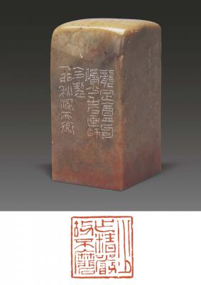 1975年作 印文: 少作精严故不磨 边款: 龚定盦句俨少老画师令制。乙卯深秋,天衡。 A QINGTIAN STONE SEAL BY HAN TIANHENG Used by Lu Yanshao Dated 1975 尺寸: 3.7×3.8×7.1cm 估价: 20,000-30,000 元