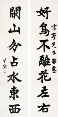 纸本 对联 识文: 好鸟不离花左右,闲山分占水东西。 款识: 宗圣先生雅鉴。尹默。 钤印: 沈尹默之印(白) SHEN YINMO SEVEN-CHARACTER COUPLET IN REGULAR SCRIPT Ink on paper, couplet 尺寸: 166.5×40.5cm ×2 估价: 60,000-80,000 元