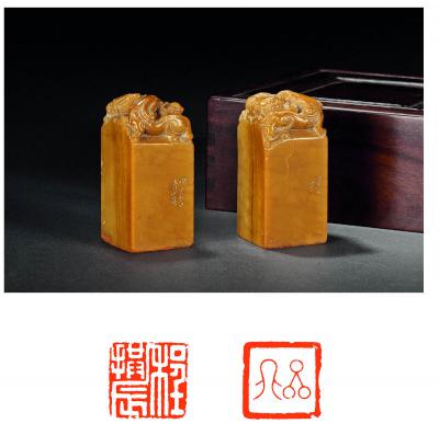 A PAIR OF SHOUSHAN STONE SEALS CARVED BY HUANG BAOYUE
