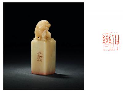 印文: 仲鸾 边款: 秋伊仿六朝印。 A ROSS QUARTZ STONE SEAL WITH DRAGON DESIGN 尺寸: 2.5×2.5×7.5cm 估价: 6,000-10,000 元