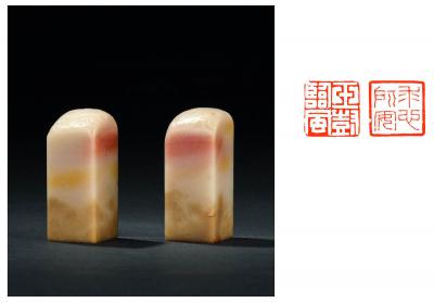 印文: 1.玉树临风 2.求心所安 说明: 配原装木盒。 A PAIR OF SHOUSHAN STONE SEALS WITH CLOUD PATTERN Note: attached with the original woodbox. 尺寸: 2.4×2.4×5.5cm ×2 估价: 15,000-25,000 元