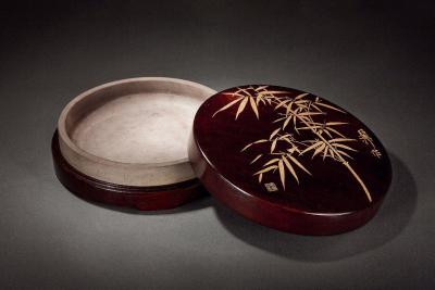 说明: 此圆形端砚集两大名家之作,虽造型简朴,却不失灵韵。砚背“紫琼”二字挥洒自如,张弛有度,砚盖所琢竹枝,清雅脱俗,清新可人,不亏出自名家之手,实在为不可多得的一方佳砚。配红木砚盒。