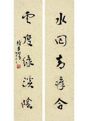 纸本 画心 识文: 水回青嶂合,云度绿溪阴。 款识: 雄才时年九十又二。 钤印: 黎雄才(白) LI XIONGCAI FIVE-CHARACTER COUPLET IN CURSIVE SCRIPT Ink on paper, mounted 尺寸: 128×31cm ×2 估价: 20,000-30,000 元