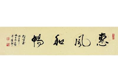 洒金纸本 画心 识文: 惠风和畅。 款识: 雄才书,时年九十九岁于广州。 钤印: 大吉祥(白) 黎雄才(白) 岭南人(朱) LI XIONGCAI CALLIGRAPHY IN RUNNING SCRIPT Ink on golden-flecked paper, mounted 尺寸: 22.5×132cm 估价: 20,000-30,000 元