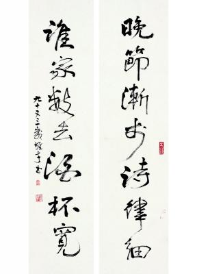 纸本 画心 识文: 晚节渐于诗律细,谁家数去酒杯宽。 款识: 九十又三岁,雄才书。 钤印: 大吉祥(白) 黎雄才(白) 岭南(朱) LI XIONGCAI SEVEN-CHARACTER COUPLET IN RUNNING SCRIPT Ink on paper, mounted 尺寸: 137×34.5cm ×2 估价: 20,000-30,000 元