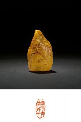 印文: 碧水青山天外天 A SHOUSHAN STONE SEAL WITH LANDSCAPE DESIGN 尺寸: 3.2×1.5×5.5cm 50.8g 估价: 20,000-30,000 元