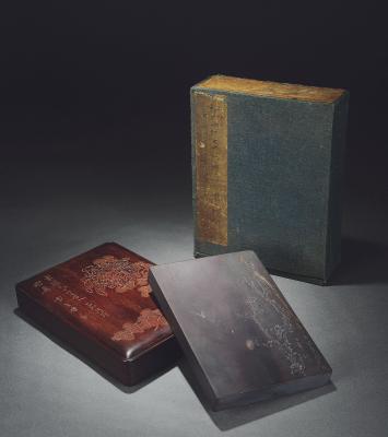 说明: 此砚极为可贵,乃清代存留至今的老坑平板端砚,材质、年份已为上佳,又有今人谢稚柳、白书章在此之上献技施艺,一株梅花傲雪迎风,琼琼独立,满枝怒放,风骨尽显。砚盖之上,亦有秋菊压枝,东篱佳色,令人遥想陶元亮遗风。此等气息,此等画意,实非大家而不能有也,无怪乎书章、陈奇夫妇视之如珍宝。今次获此上拍,自当喜不自禁。配红木砚盒。