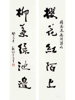 纸本对联 1983年作 识文: 樱花红陌上,柳叶绿池边。 款识: 周恩来总理诗句,癸亥冬,新我左笔。 钤印: 费新我(朱) FEI XINWO FIVE-CHARACTER COUPLET IN RUNNING SCRIPT Ink on paper, couplet Dated 1983 尺寸: 68×18cm ×2 估价: 8,000-12,000 元