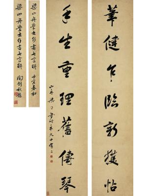 签条: 梁山舟学士行书七言联。壬寅春和,陶剑秋题。钤印: 栗里(朱) 陶(白)