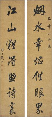 纸本 对联 识文: 烟水幸堪供眼界,江山犹得助诗豪。 款识: 又峰六兄属,醇士戴熙。 钤印: 戴熙(白) 翰林供奉(朱) 鉴藏印: 镏皮僊馆(白,二次) DAI XI SEVEN-CHARACTER COUPLET IN RUNNING SCRIPT Ink on paper, couplet 尺寸: 134×29cm ×2