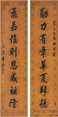 蜡笺 对联 识文: 勋力有章华夏归德,柔嘉惟则恩威并隆。 款识: 信之仁弟总戎鉴。仪叜李鸿章。 钤印: 李鸿章印(朱) 青宫太傅(朱) LI HONGZHANG EIGHT-CHARACTER COUPLET IN RUNNING SCRIPT Ink on wax paper, couplet 尺寸: 168.5×41.5cm ×2