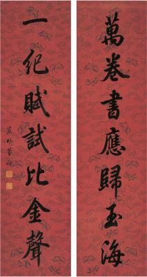 行书 七言联 描云蝠纹绢本 对联 识文: 万卷书应归玉海,一纪赋试比金声。 款识: 蔗林董诰。 钤印: 董诰(白) 太保之章(朱) DONG GAO SEVEN-CHARACTER COUPLET IN RUNNING SCRIPT Ink on paper with clouds and bats pattern, couplet 尺寸: 144×38cm ×2