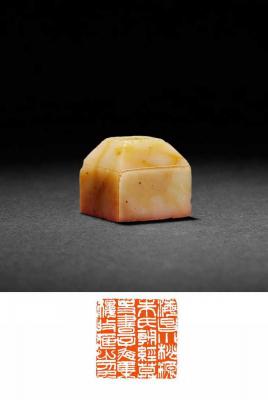 印文: 海昌小桃源朱氏朝经暮史书子夜集楼收藏之印 A SHOUSHAN STONE SEAL WITH FRET PATTERN 尺寸: 3.4×3.3×3.1cm 估价: 10,000-20,000 元