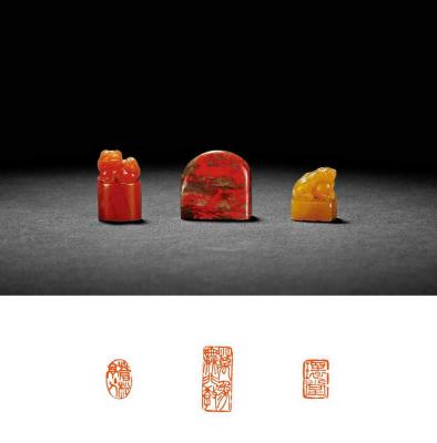 印文: 1.苍松亭主人 2.万象无非教 3.环堂 边款: 2.静邨。 3.静邨。 THREE TIANHUANG, CHANGHUA BLOODSTONE OR CARNELIAN SEALS 尺寸: 1.6×1×2.1cm 6.2g 2.7×1.2×2.7cm 1.7×1.1×2.7cm 估价: 150,000-200,000 元