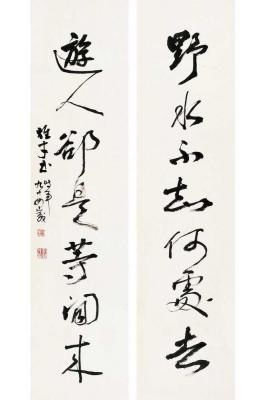 纸本 镜片 识文: 野水不知何处去,游人却是等闲来。 款识: 雄才书,时年九十四岁。 钤印: 古端人也(朱) 黎雄才印(白) LI XIONGCAI SEVEN-CHARACTER COUPLET IN CURSIVE SCRIPT Ink on paper, mounted 尺寸: 139×35cm ×2 估价: 30,000-50,000 元