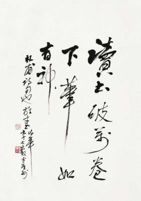 纸本 镜片 识文: 读书破万卷,下笔如有神。 款识: 杜甫诗句也。雄才书,时年九十七岁于广州。 钤印: 岭南人(朱) 黎雄才印(白) LI XIONGCAI DU FU’S POEM IN CURSIVE SCRIPT Ink on paper, mounted 尺寸: 70×45.5cm 估价: 20,000-30,000 元