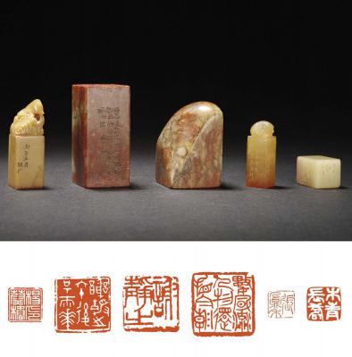 FIVE SHOUSHAN STONE SEALS CARVED BY CHEN BANDING, YU FEIAN, MA GONGYU AND ZHANG YUECHENG
