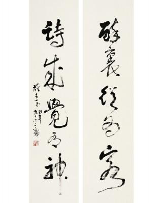 纸本 镜片 识文: 醉里从为客,诗成觉有神。 款识: 雄才书,时年九十又二岁。 钤印: 黎雄才(白) LI XIONGCAI FIVE-CHARACTER COUPLET IN CURSIVE SCRIPT Ink on paper, mounted 尺寸: 138.5×35cm ×2 估价: 50,000-60,000 元