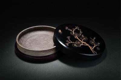 AN INKSTONE CARVED WITH PLUM BLOSSOM PATTERN BY SHEN JUECHU AND INSCRIBED BY XIE ZHILIU