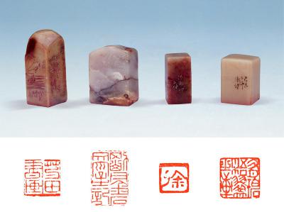 印文: 1.芍田书画 2.刚父金石文字之记 3.徐 4.有碧梧翠竹之轩 边款: 1.壬戌三月客金陵作并记灯下,三改。橅极纯正之汉印,非用四十年功夫不得老当,二仲刻,时年五十又八矣。 2.庚子春日二仲仿汉。 3.仿元印,二仲。 4.己未二仲仿汉。 尺寸: 2.5×2.5×3.5cm 2.3×2.3×5.8cm 1.8×1.8×3.8cm 3.3×2.6×4.3cm