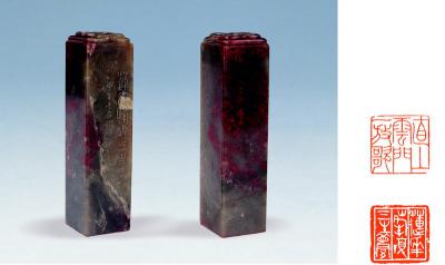 林千石刻鸡血石如意浮雕对章