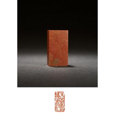 印文: 朱贲园读书记 边款: 易厂 A SHOUSHAN CINNARBAR STONE SEAL BY YI DACHANG 尺寸: 2.8×1.3×5cm 估价: 8,000-15,000 元 作者简介: 易大厂(1874~1941),原名廷熹,字季复、魏斋、韦斋,广东鹤山人。书、画、篆刻、碑板、音韵、文字、乐理等无不精研,为陈沣嫡传弟子。历任暨南大学、国立音乐学院教授等。著作甚丰。