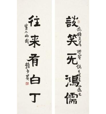 纸本 对联 识文: 谈笑无鸿儒,往来有白丁。 款识: 志雄兄属,陋室铭,反其意而为之,岂不妙哉。赖少其。 钤印: 赖少其印(白) 书意(朱) LAI SHAOQI FIVE-CHARACTER COUPLET IN RUNNING SCRIPT Ink on paper, couplet 尺寸: 103×31cm ×2 估价: 30,000-40,000 元