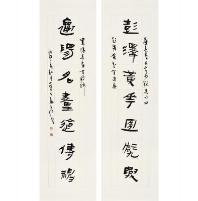 款识: 集秦简文字为联。其句曰:彭泽黄花宜逸兴,襄阳名画会传神。时维丁亥秋月,燕客马子恺书。
