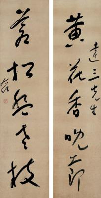 纸本 对联 1940年作 识文: 黄花香晚节,苍松盘老枝。 款识: 达三先生,右任。 钤印: 右任 YU YOUREN CALLIGRAPHY COUPLET WITH FIVE CHARACATERS A LINE IN RUNNING SCRIPT Ink on paper, hanging scroll Dated 1940 尺寸: 129.5×31.5cm ×2