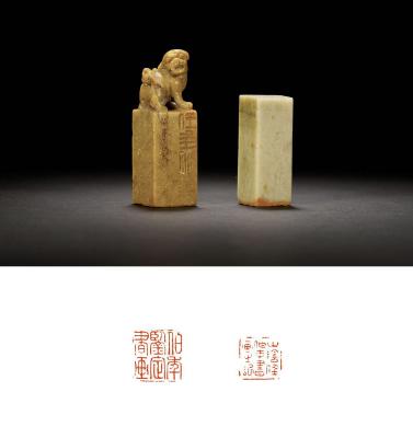 1881年作 印文: 1. 山阴任伯年书画之记 2. 伯年鉴定书画 边款: 1. 攸嘉仿汉。 TWO SEALS FOR REN BONIAN BY YOU JIA 尺寸: 1.9×1.9×5cm 2.2×2.2×7cm 估价: 10,000-20,000 元