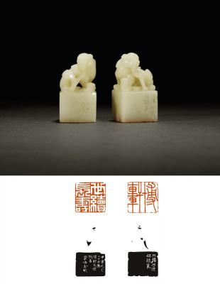 A PAIR OF WHITE ROSS QUARTZ STONE ‘MYTHICAL BEAST’ SEALS CARVED BY JIN CHENG