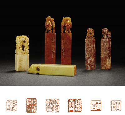 A GROUP OF SIX SHOUSHAN STONE AND QINGTIAN STONE SEALS FOR ZHENG YUANJU AND CARVED BY CHEN JULAI, FANG JIEKAN AND HUANG GAONIAN