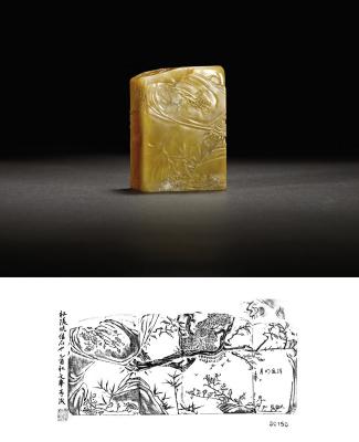 说明: 此件杜陵石章方正厚重,石质温润,石色绚丽而过度自然,作者依石之格路纹理作薄意,构图饱满,借色巧妙,繁简得宜,洵为佳作。