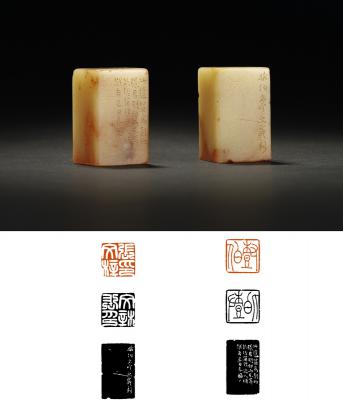 QING DYNASTYA PAIR OF SHOUSHAN STONE SEALS CARVED BY WU RANGZHI