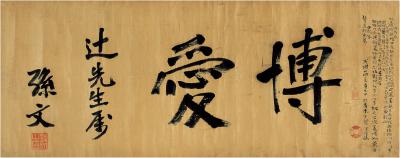 题跋: 此为我孙先总理题赠日友听花先生(前北京顺天时报馆主笔,能诗工戏曲)之遗墨,听花逝世后,辗转归津,忆津于民国元年在大阪,文新会汤文聪学兄同组商学联合会欢迎总理时,曾伴戴天仇、高君述数公侍总理摄有合影,津时司书记并手录有总理口述演辞,几经变乱,都归散佚,今幸得此于劫灰之后,盖愧如曩日之亲承声音颜色矣。民国廾四年重九日,仁寿木子梁津谨志。