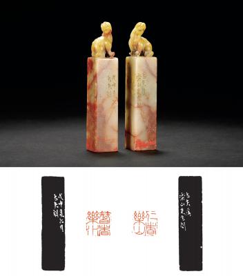 A PAIR OF SHOUSHAN STONE ‘BEAST’ SEALS CARVED BY DUN LIFU