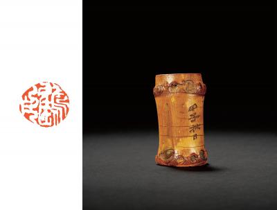 印文: 鹤印 边款: 甲子秋日。 QING DYNASTYA BAMBOO ROOT SEAL 尺寸: 2.9×2.7×5.2cm 估价: 10,000-20,000 元