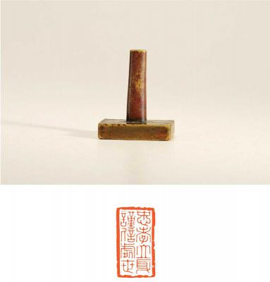 印文: 忠孝立身谨信处世 展览: 《恭王府艺术系列展——金石藏》P146。 MING DYNASTY A BRONZE SEAL Exhibition: Seal Exhibition·Art exhibition series in prince Kung Palace, p.146. 尺寸: 4.7×2.5×5.6cm 估价: 20,000-30,000 元