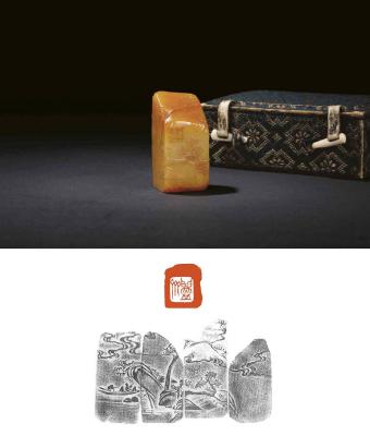 印文: 眉斋 边款: 甲辰重五自刻。 说明: 田黄石,色纯质糯,让人爱不释手,薄意雕山水,布局得当,工艺精美。 A TIANHUANG STONE SEAL LIGHTLY CARVED WITH LANDSCAPE DESIGN 尺寸: 2.0×2.0×4.5cm 44g 估价: 180,000-250,000 元