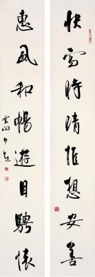 纸本 对联 识文: 快雪时晴惟想安善,惠风和畅游目骋怀。 款识: 云间白蕉。 钤印: 天下第一嬾人(朱) 兴到为止(白) 吴国白蕉(白) 海曲之印(朱) BAI JIAO EIGHT-CHARACTER COUPLET IN RUNNING SCRIPT Ink on paper, couplet 尺寸: 127×20.5cm ×2 估价: 80,000-100,000 元
