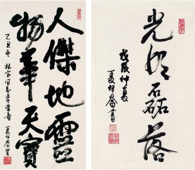 1. 人杰地灵,物华天宝。乙丑(1985年)冬,林宝同志五十荣寿,夏伊乔贺。钤印: 夏伊乔(朱)艺海堂(朱)