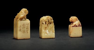 边款: 1.仿汉官私印法石逸 THREE SHOUSHAN ‘FURONG’ STONE SEALS 尺寸: 2.4×2.4×5.6cm 2.2×2.2×4cm 2.4×2.5×4.1cm 估价: 10,000-20,000 元