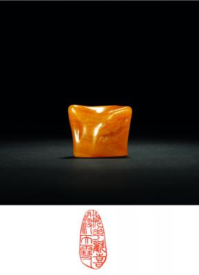 说明: 此黄寿山冻石,形如金元宝,色如枇杷,纯净无瑕,如冰似玉。肌理间有萝卜纹,似田黄冻,唯无石皮。一面浅刻楷书款识,语出《山海经》,原是赞美玉的五德,今借此喻此石,可谓恰如其分。另一面浅雕祥云缭绕,间有蝙蝠翩至。蝠福相通,寓意福气东来,吉祥如意。