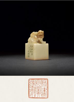 1918年作 印文: 诗画长留天地间 边款: 诗画长留天地间,大正戊午菊月改,百拙镌。 QING DYNASTY A WHITE SHOUSHAN ‘FURONG’ STONE ‘BEAST’ SEAL Dated 1918 尺寸: 4.2×4.1×7.1cm 估价: 30,000-50,000 元