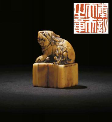 印文: 奉训大夫之章 说明: 奉训大夫为明代文散官名,官从五品。此印章,包浆润泽,浑然大气,具有典型的明代风格。 AN IVORY SEAL WITH AUSPICIOUS BEAST KNOT 尺寸: 3.3×2.8×5.1cm 估价: 20,000-30,000 元