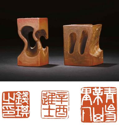 印文: 1.钱琪之印 辛酉进士 2.青阳梅山里人 TWO BAMBOO-ROOT SEALS 尺寸: 4×4×7.8cm 5.2×5.1×6.6cm 估价: 20,000-30,000 元