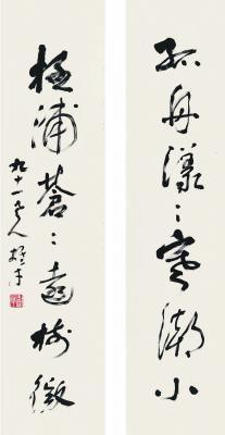纸本 镜片 识文: 孤舟漾漾寒潮小,极浦苍苍远树微。 款识: 九十一老人雄才。 钤印: 黎雄才(白) LI XIONGCAI SEVEN-CHARCTER COUPLET IN RUNNING SCRIPT Ink on paper, mounted 尺寸: 139×34.5cm ×2 估价: 30,000-50,000 元