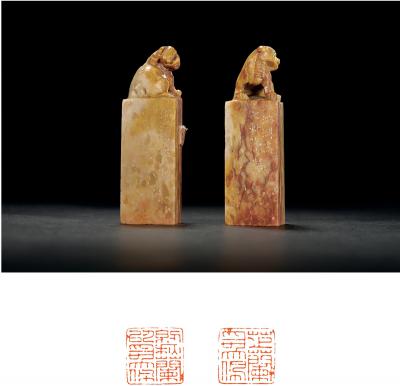A PAIR OF QINGTIAN STONE ‘BEAST’ SEALS ENGRAVED BY YE LUYUAN